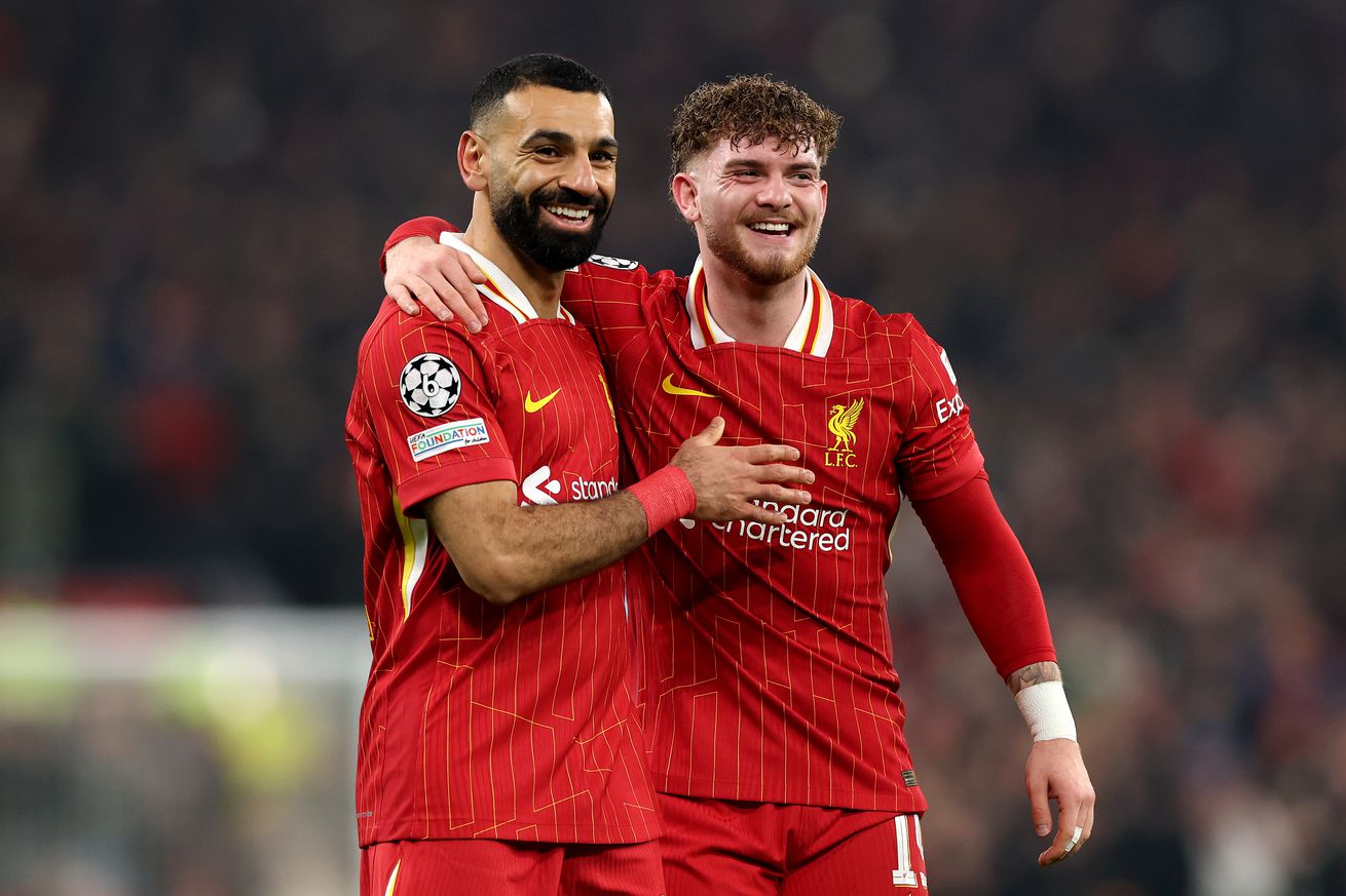 Harvey Elliott of Liverpool celebrates with teammate Mohamed Salah after scoring his team’s second goal during the UEFA Champions League 2024/25 League Phase MD7 match between Liverpool FC and LOSC Lille at Anfield on January 21, 2025 in Liverpool, England. | Photo by Carl Recine/Getty Images