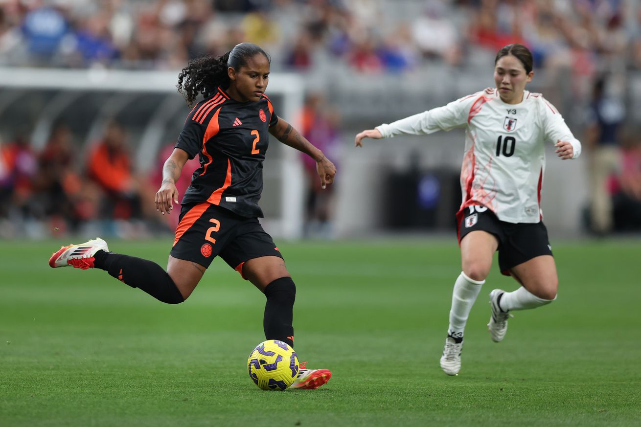 Mary Jose Álvarez #2 of Colombia looks to pass the ball in front of Fuka Nagano #10 of Japan during the second half of the 2025 SheBelieves Cup at State Farm Stadium on February 23, 2025 in Glendale, Arizona. | Photo by Jeremy Chen/Getty Images