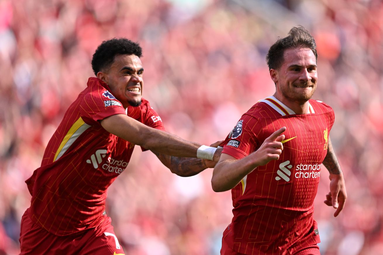 Alexis Mac Allister of Liverpool celebrates scoring his team’s second goal with teammate Luis Diaz during the Premier League match between Liverpool FC and Tottenham Hotspur FC at Anfield on April 27, 2025 in Liverpool, England. | Photo by Liverpool FC/Liverpool FC via Getty Images